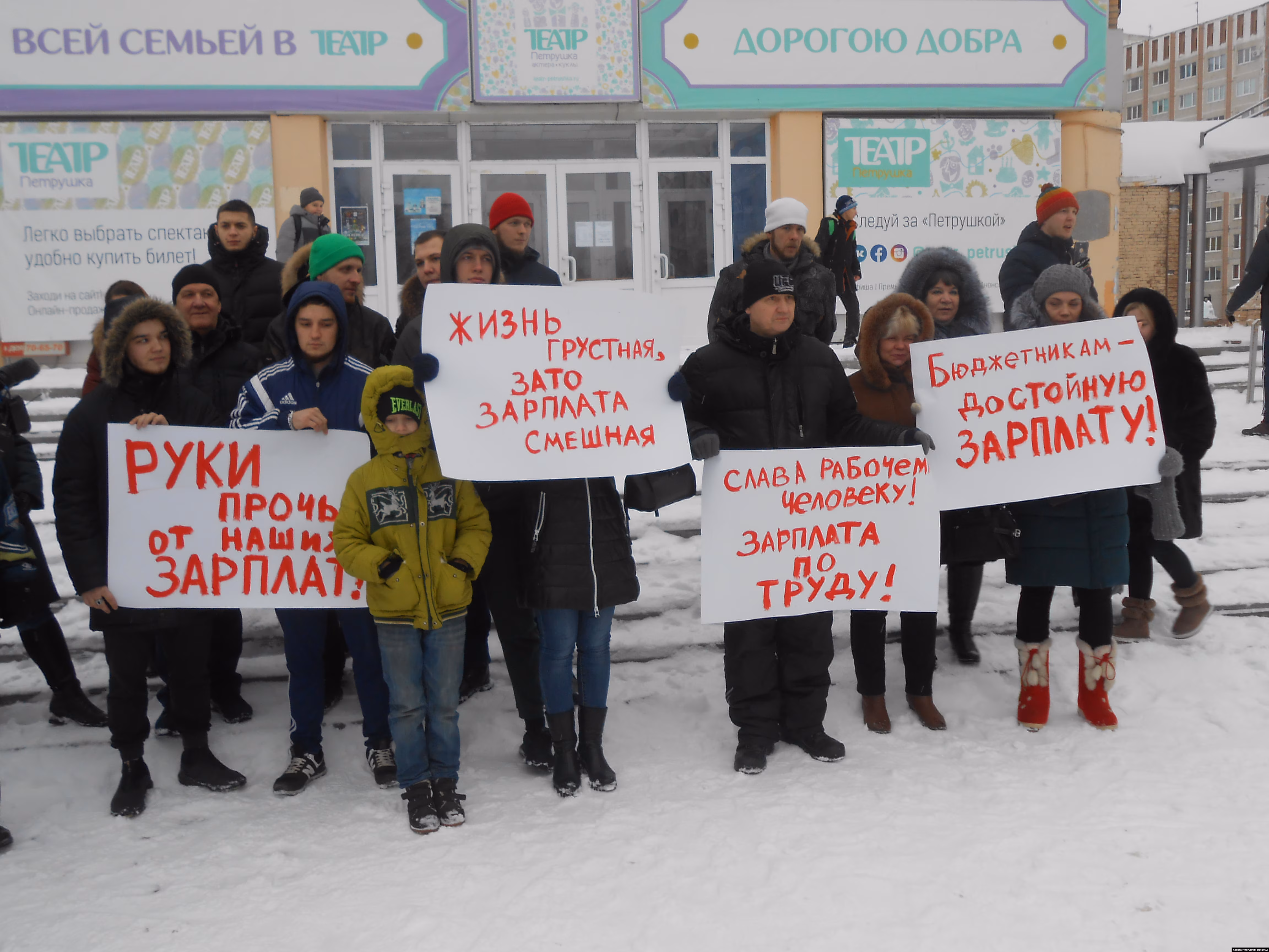 Акция протеста была согласована администрацией города, в ней приняли участие более 40 человек. Протестующие развернули плакаты с лозунгами "Руки прочь от наших зарплат", "Бюджетникам – достойную зарплату", "Жизнь грустная, зато зарплата смешная".