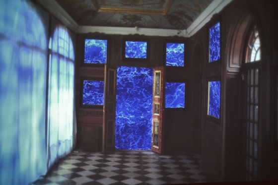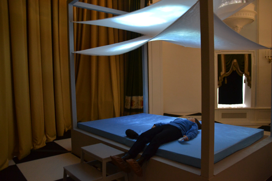 Голландский домик. Сны Петра Великого. Вид экспозиции Однако дворец все-таки обязывает, и это не только охранные требования (например, к стенам Белого зала нельзя ничего крепить, в том числе временные конструкции павильонов), но и стилистическая рафинированность, которой вовсе нет в Монплезире. Так что цветовое решение диктовал зал: павильоны «снов» вписались в его нежно-голубой объем, сохранив, впрочем, пол «шашечками» на голландский манер, как в Монплезире. Доминирующий голубой цвет можно было бы назвать морским, но в контексте хочется сказать, что он, скорее, пижамный. Цвет, шум моря, проекции Монплезира с парусными судами за окнами сообщают выставке почти терапевтический эффект. Его усугубляет и отсутствие экспликаций. Вам никто не сообщит автора, название и датировку экспонатов: ведь это сон — необремененное восприятие. И хвала традиционному музею, удержавшемуся от просветительства в пользу иррационального погружения. Голландская живопись — та самая, которую Петр лично закупал на аукционах, — представлена без пышных рам, на одних подрамниках. Неожиданно ремесленный вид старых полотен тоже приятно снижает градус формальности. Но главное — там же, за павильонами, можно поваляться на кровати. Шумит море, вместо полога — тонкая ткань с проекцией голубого неба, летящих чаек и корабельных мачт. Кровать воспроизводит царское ложе в Монплезире: ход очевидный, но каждому ведь приятно упасть под небо и представить себя властительным мечтателем.