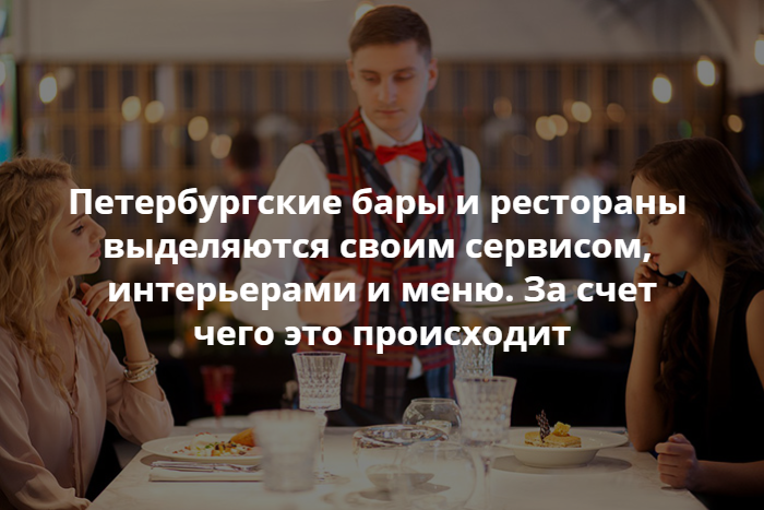 По словам ресторанного эксперта и организатора премии WHERETOEAT Ирины Тиусониной, обслуживание в петербургских ресторанах отличается, например, от московского, тем, что здесь в основном работают местные жители, из-за чего уменьшается текучка кадров. Как рассказала «Бумаге» пиар-директор ресторанов Italy Group Мария Бочарова, сотрудники в Москве приходят для быстрого заработка, а в Петербурге работают по несколько лет. Она также отмечает, что в Петербурге текучка кадров меньше, что положительно влияет на уровень сервиса.А зачем кафе и бары проводят лекции, бранчи и даже велопрогулки?