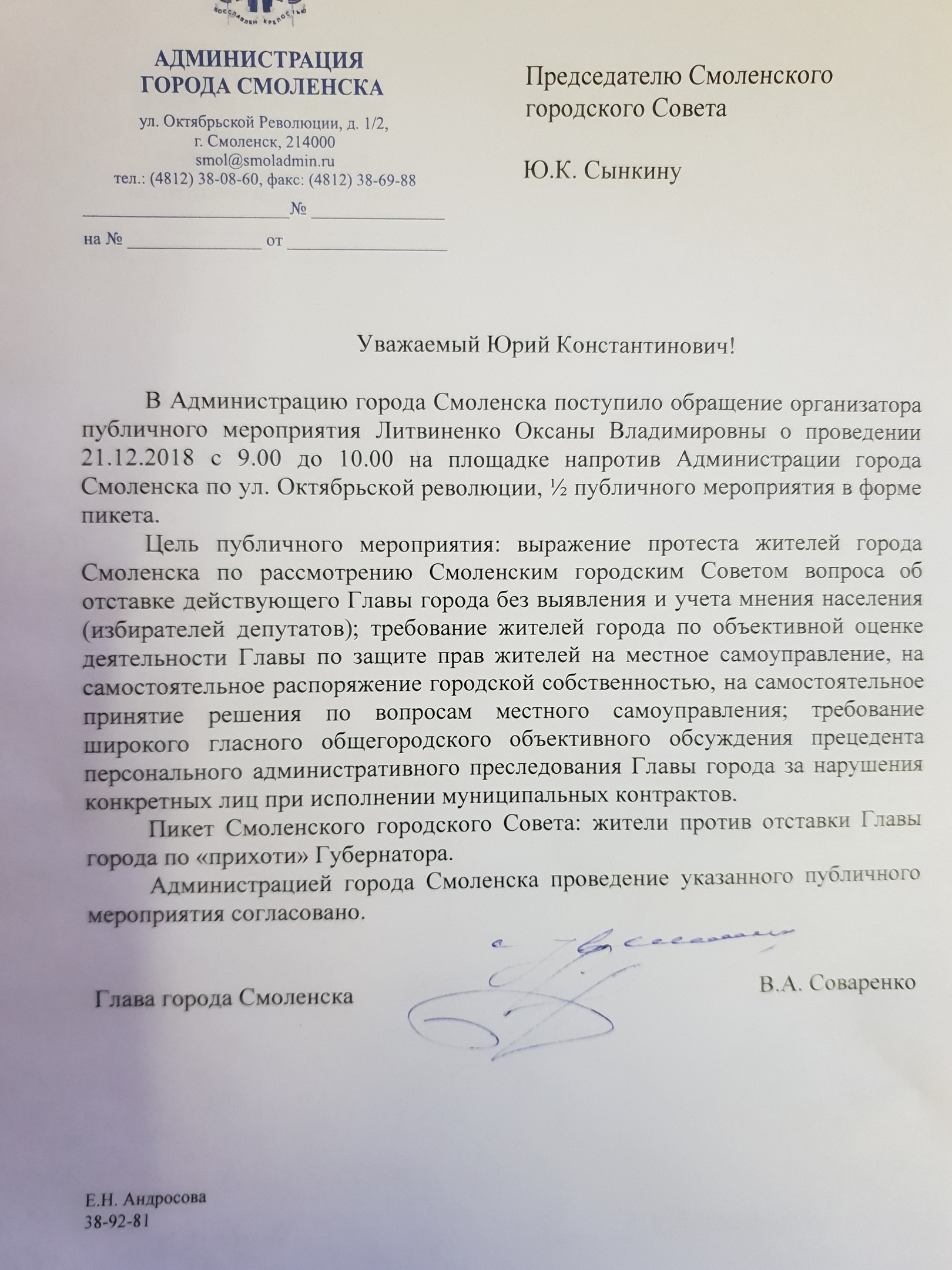 Мы, неравнодушные жители Города Смоленска, обращаемся к Президенту нашей страны Путину Владимиру Владимировичу, к Володину Вячеславу Викторовичу, Неверову Сергею Ивановичу, Кириенко Сергею Владиленовичу с просьбой вмешаться в сложившуюся ситуацию и не дать Губернатору Алексею Островскому отстранить от должности Главу города Смоленска Владимира Соваренко! Мы обращаемся к депутатам городского совета с призывом не идти на поводу у Островского, а прислушаться к мнению Смолян — их избирателей!