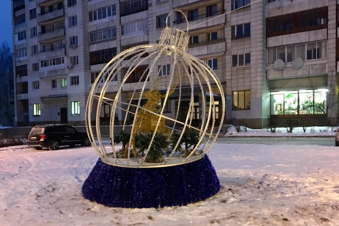 В Тихвине установили новогоднюю скульптуру оленя в шаре. Ее повредили в первый же день, пытаясь украсть мишуру