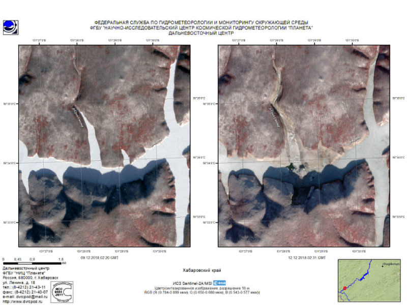 Анализ разновременных данных КА "Sentinel-2А" за 9 декабря и 12 декабря показал "значительные ландшафтные изменения", произошедшие в промежуток между этими днями. "А именно: на снимке за 12 декабря отсутствует часть сопки (макушки)", - подтвердили эксперты. Кроме того, в сравнении со снимком за 9 декабря, просматривается изменение покрова земли, в частности отсутствие растительности, а на замерзшем русле реки наблюдается вода.