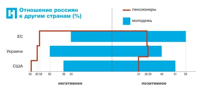 Для сравнения: среди людей пенсионного возраста таких 80%. Не одобряющих его деятельность, соответственно, 41% молодых и 19% пожилых). Хотя и среди молодежи сохраняются (особенно в провинции) представления о русофобии, о заговоре Запада, но они существуют как бы отдельно от интересов и реальной жизни молодежи. Молодежь в целом отличается гораздо более высокой симпатией и интересом к Западу, к современной культуре, моде, чем другие возрастные категории. Так, например, «положительно» относятся к США 51% опрошенных в возрасте 18-24 года, негативно — 39% (а среди людей старше 65 лет — 21% и 65%). К ЕС, соответственно, позитивно относятся 59% против 33% (у пожилых респондентов картина обратная: 58% воспринимают ЕС негативно, и лишь 28% — положительно). Позитивные установки к Украине отмечаются у 40% молодых (негативные — у 50%), а из пенсионеров к бывшей братской республике «хорошо» относятся лишь 29%, а 60% — «плохо» и «очень плохо».