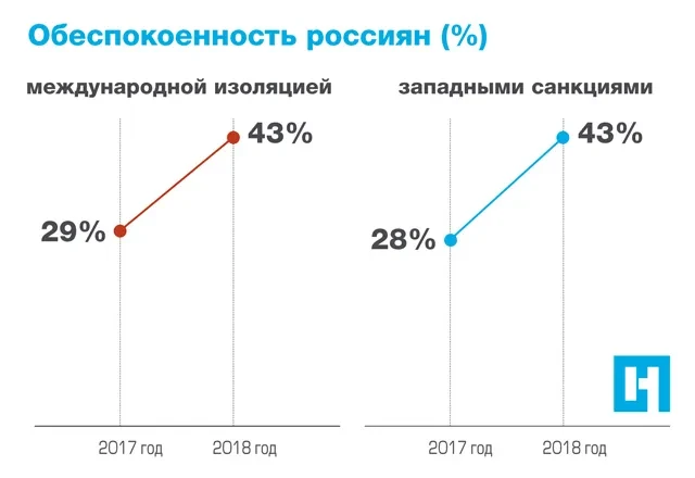 В 2017 году обеспокоенность международной изоляцией проявляло 29% населения, а в нынешнем 2018 году их стало уже 43%. Примерно такая же картина встревоженности последствиями российской политики и вызванной ими западными санкциями: 28% в 2017 году и 43% в году нынешнем.