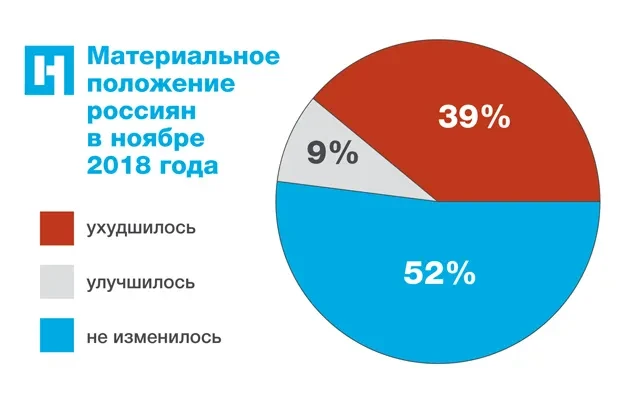 По мнению 39% опрошенных в ноябре 2018 года, материальное положение их семей за последний год ухудшилось, а улучшилось лишь у 9%, у остальных не изменилось. Общий семейный доход (в среднем по России) сегодня (при двух работающих взрослых!) составляет чуть более 40 тыс. рублей (в глазах людей — это граница прожиточного минимума). При этом у примерно половины семей он ниже 30 тыс. (у пенсионеров — 26 тысяч с небольшим), у 28% — от 30 до 50 тыс. рублей, у 11% — от 50 до 70 тыс.рублей; у такого же числа семей — свыше 70 тысяч рублей (последняя группа представлена главным образом чиновниками и предпринимателями). Такая картинка очень отличается от тех, что рисуют наши высшие чиновники.