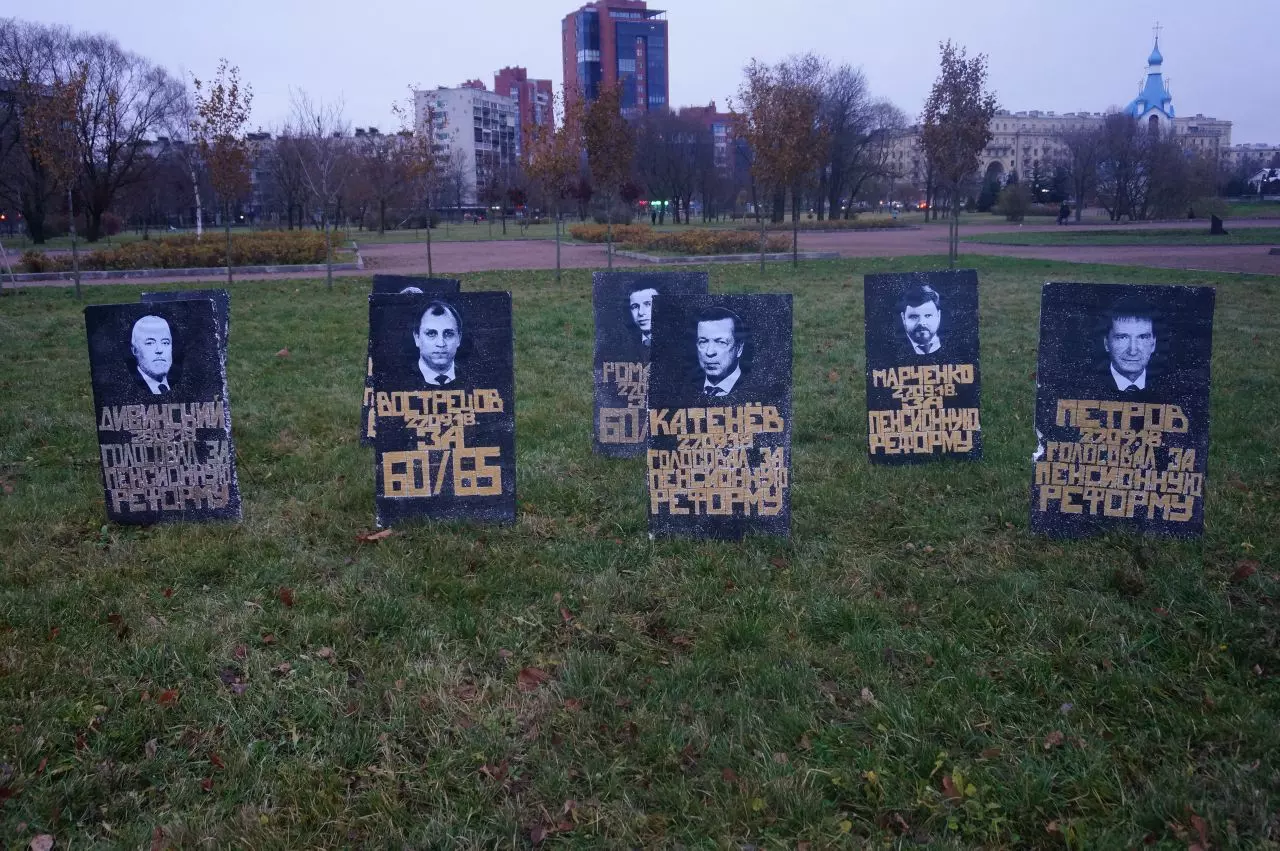 В Архангельске за две недели до этого активисты, пришедшие на митинг против пенсионной реформы, принесли с собой гроб, в который кидали символические годы жизни и миллионы рублей — в виде бумажных листков с надписями. Другой «похоронный» протест против пенсионной реформы состоялся 7 ноября в Санкт-Петербурге: активисты «Левого фронта» и Российского социалистического движения установили надгробия депутатов, проголосовавших за проведение пенсионной реформы. На надгробиях были изображены Виталий Милонов, Сергей Вострецов, Владимир Катенев, Евгений Марченко и другие депутаты из Петербурга. «По мнению активистов, единороссы предали своих избирателей, проголосовав за повышение пенсионного возраста, а 27 сентября (дата голосования) стало датой окончательной политической смерти «Единой России» и олигархического режима Путина», — говорится на странице РСД во «ВКонтакте». За эту акцию активистов оштрафовали на 20 тысяч рублей.