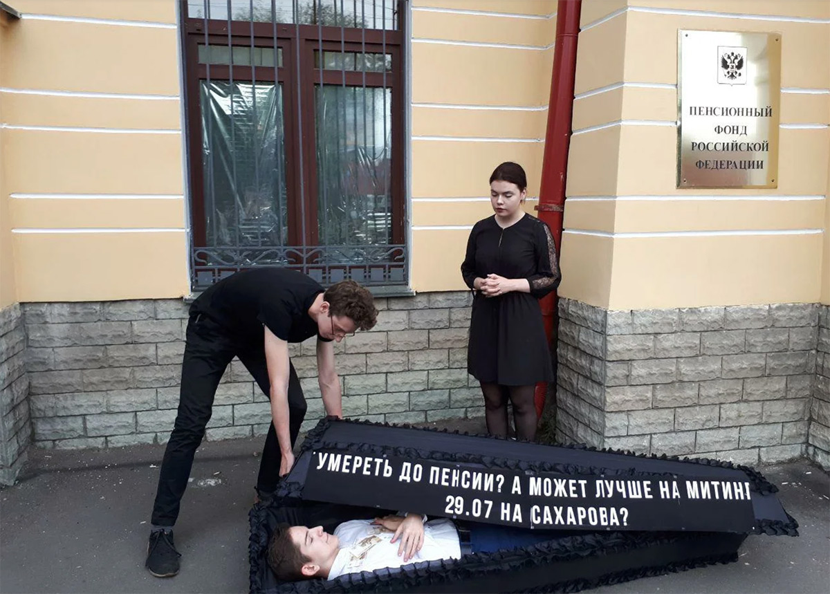 Это далеко не единственная «похоронная» акция «Весны». 28 июля уже в Москве активисты пригласили москвичей на митинг против пенсионной реформы таким образом: возле главного офиса Пенсионного фонда лежал гроб с 18-летним активистом Богданом, а рядом стояла грустная девушка в трауре. Надпись на гробе гласила: «Умереть до пенсии? А может лучше на митинг 29.07 на Сахарова?»