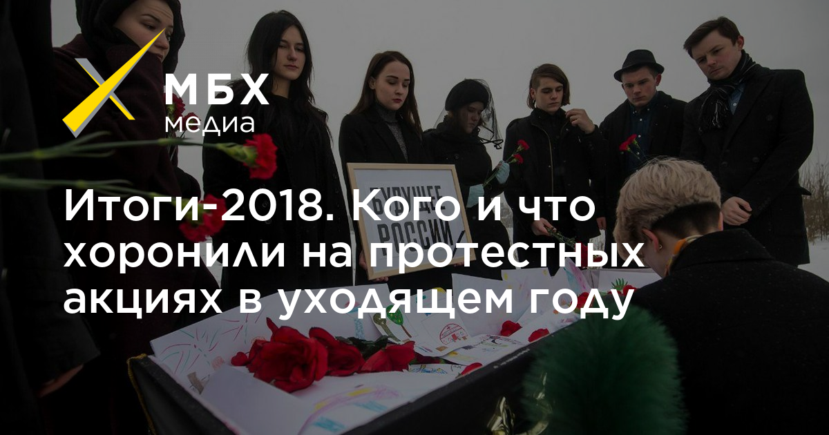 Образ смерти и связанные с ней символы — похороны, гробы, траурные ленты и кресты — нередко встречаются на российских протестных мероприятиях. За этот год мы насчитали больше десяти акций, на которых «хоронили» те или иные общественные явления или конкретных людей — и это только те, о которых написали медиа. Мы изучили самые интересные и узнали, почему тема смерти так популярна у оппозиционных активистов.