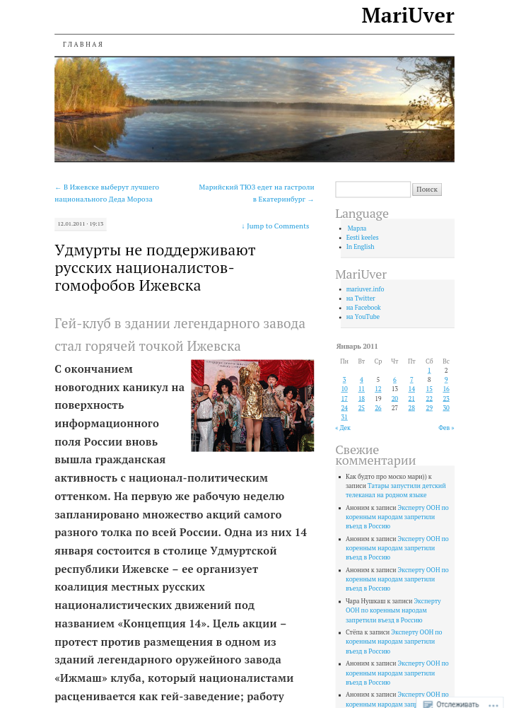? Когда земляков бьют в спину… Как известно, на региональной информполяне есть неоднозначный портал под незатейлевым названием MariUver. На облицовочной вкладке владелец выделенного сайта гордо именует его “Страницей, посвященной марийцам, Республике Марий Эл, финно-угорским народам”. Темы там — уже понятно — будируются сложные: национальные, в категоричной упаковке и при непринуждённой подаче. Вроде бы нормально, попривыкли уже. Шумит и ворчит? — ну, и ладно. Да пусть хоть “стучит в кастрюлю”. Мало ли кто сейчас из снискавших провокативность в событийном сегменте всякое распыляет и разгоняет. Но не совсем так. Мониторинг контента анализируемого рупора явно демонстрирует деятельность по ретрансляции на нашу территорию евроатлантических взглядов. Проще сказать, обыкновенно антироссийских. Как в политическом плане, так и даже в культурном аспекте.