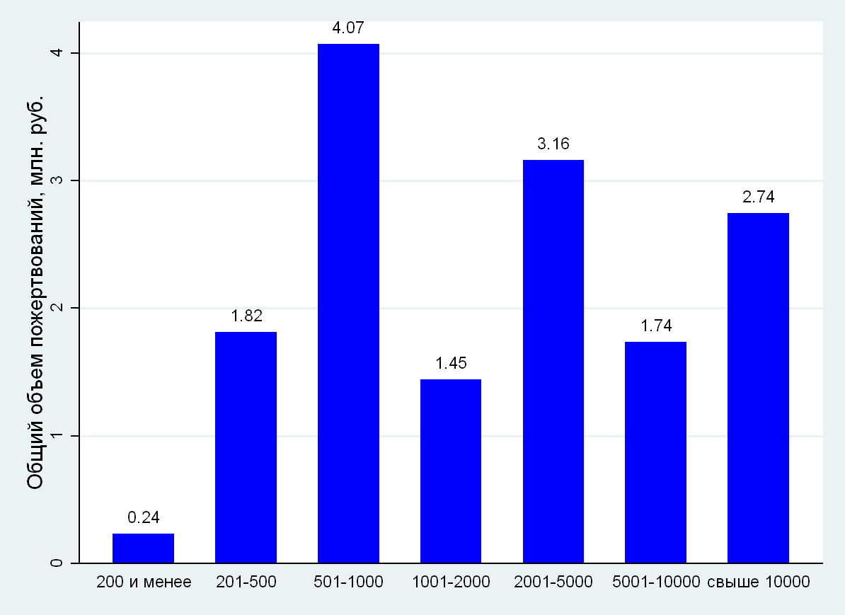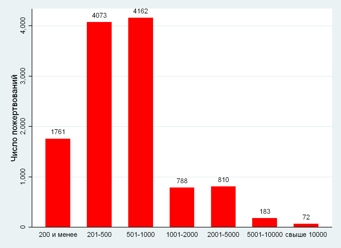 1000 руб. Две трети (74.9%) всех пожертвований укладывались в суммы от 500 до 1000 руб., 23% — от 1001 до 10 тыс. руб. Три перевода были на суммы 500 тыс. руб и больше, включая самый крупный перевод — 1 млн 300 тыс. руб. от человека, которого я не знаю. Откровенно говоря, я думала, что за этим именем скрывается кто-то из моих состоятельных друзей, спросила, услышала: «К сожалению, это не я», — последовал ответ один, второй и третий.