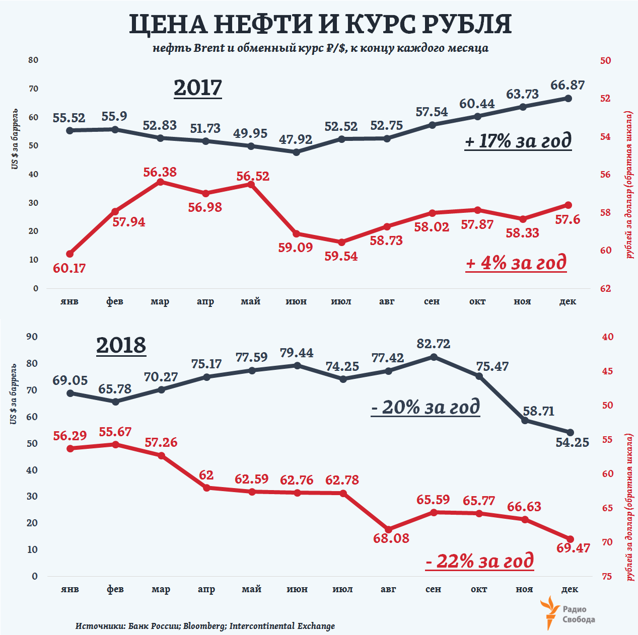 “Курс рубля уже практически не зависит от изменений цен на нефть”, – утверждал в конце ноября г-н Силуанов. Сравним: в течение 2017 года и нефть дорожала, и курс рубля вырос, но – в четыре раза меньше (к $), чем цена нефти. В 2018 году темпы их падения уже почти совпали. Цена нефти Brent на конец года – по котировкам утренних торгов 31 декабря на бирже в Лондоне: