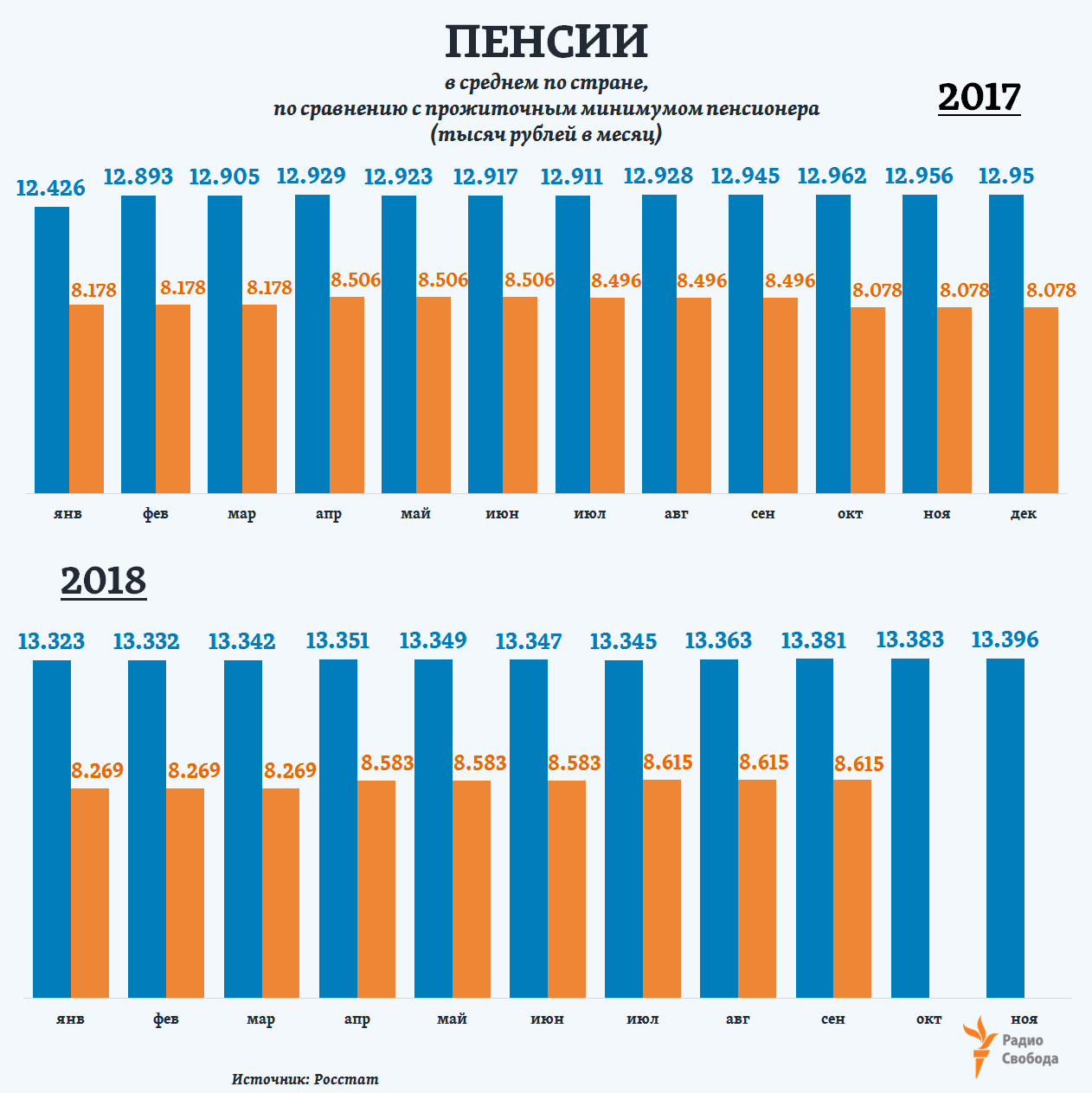 Средняя по России начисленная пенсия за 11 месяцев 2018 года, судя по данным Росстата, выросла лишь на 0,5%. Для сравнения, это в 8 раз меньше, чем за весь 2017 год: