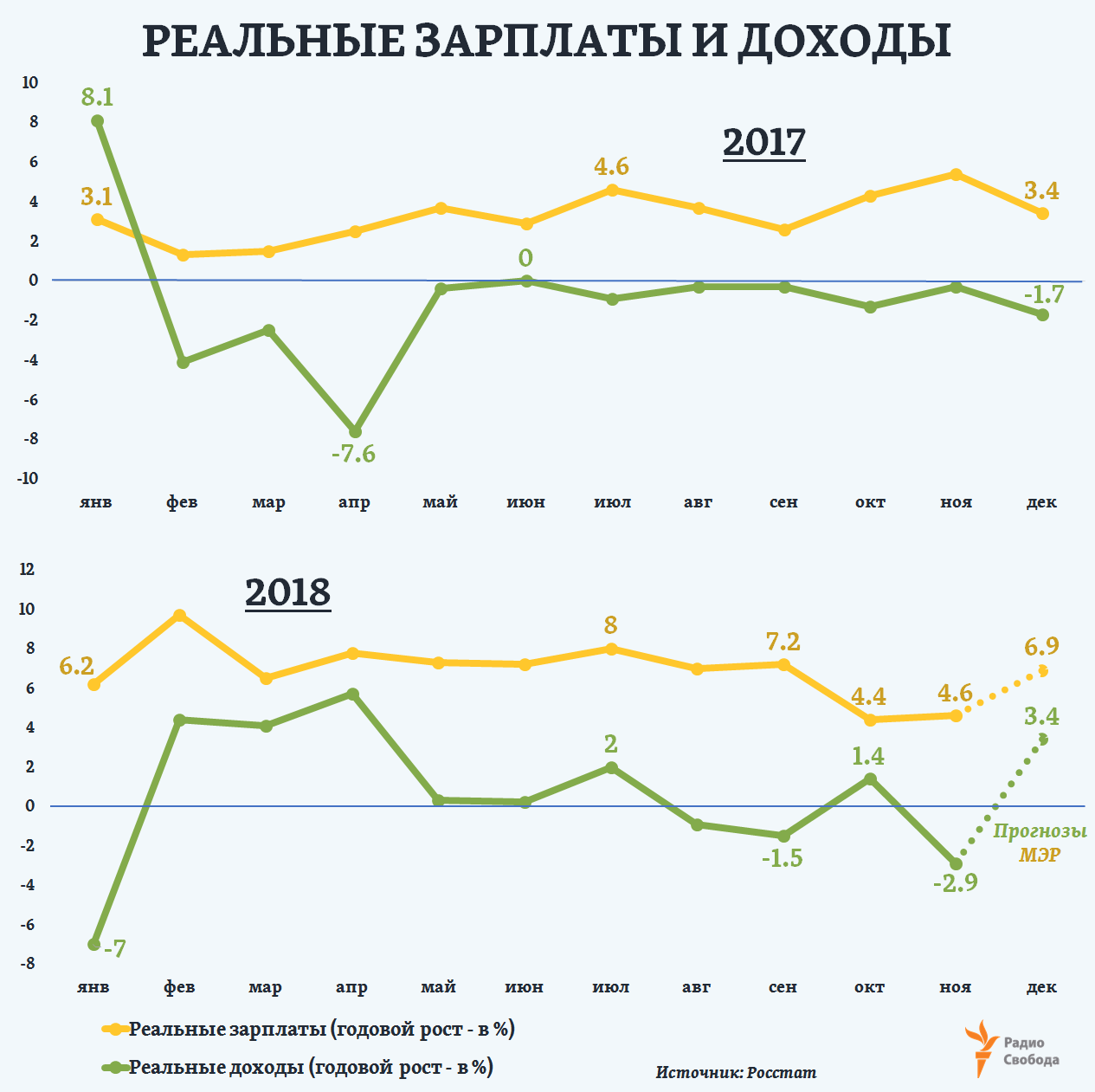 Первые официальные оценки за 2018 год Росстат опубликует лишь в начале февраля. А текущий прогноз Министерства экономического развития (МЭР) исходит из того, что рост ВВП России в 2018 году составит 1,8%, в 2019-м – лишь 1,3%. Эти показатели в 2–3 раза ниже прогнозируемых, в частности, Международным валютным фондом (МВФ) среднемировых темпов.