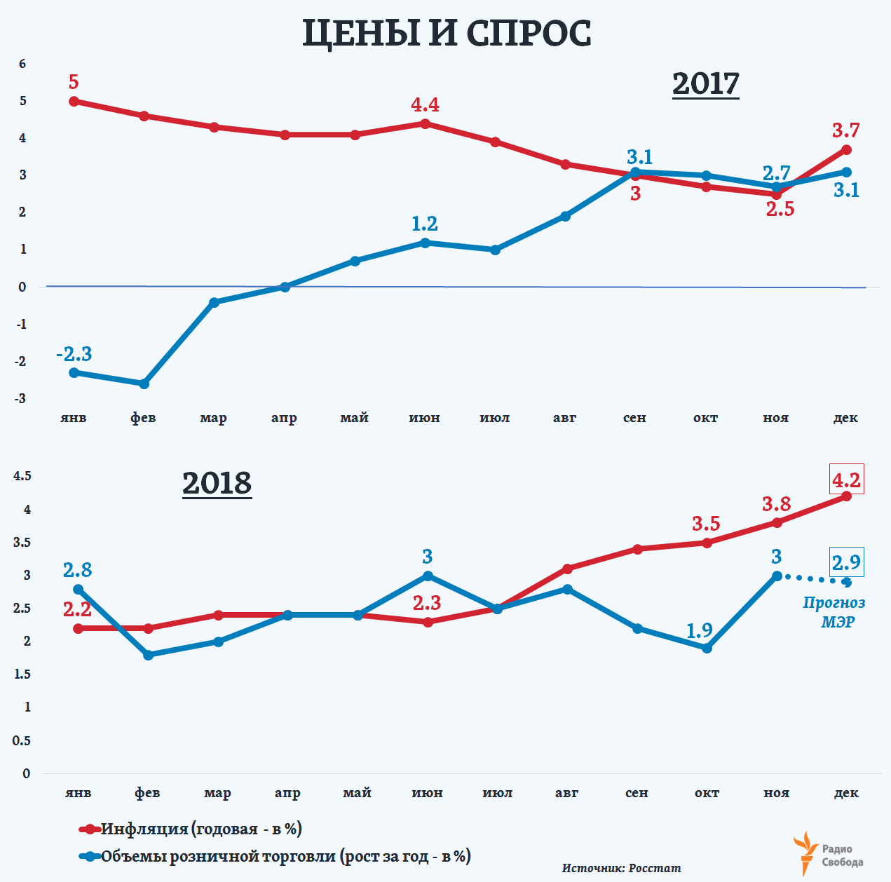 Первые оценки роста потребительских цен в стране за 2018 год Росстат представил 29 декабря – 4,2%. При этом рост объемов розничной торговли (как основной из показателей платежеспособного спроса населения) также оказывается близким к тем прогнозам, которые были представлены год назад (2,9%): в целом за январь-ноябрь – 2,6%: