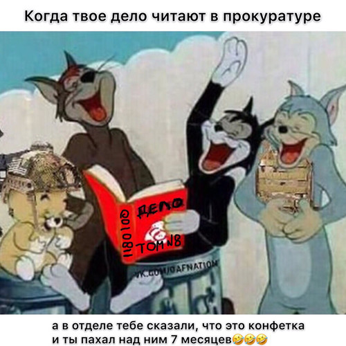 На другом популярном меме — сцена из мультфильма про Тома и Джерри. Кот читает книгу, на которой написано «том 8», и смеется вместе с товарищами. Подпись гласит: «Когда твое дело читают в прокуратуре, а в отделе тебе сказали, что это конфетка, и ты пахал над ним семь месяцев».