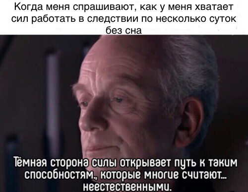 Переработкам следователи вообще посвящают много шуток. Вот кадр из советского мультфильма про Винни-Пуха с подписью: «Выходные в полиции странный предмет, они как бы есть, и как бы их нет». Другой мем носит мистический характер и отсылает к «Звездным войнам»: «Когда меня спрашивают, как у меня хватает сил работать в следствии по несколько суток без сна — "Темная сторона силы открывает путь к таким способностям, которые многие считают… неестественными"».