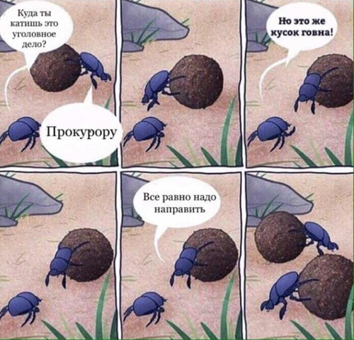 Передача уголовного дела в прокуратуру — еще одна важная тема шуток в «Коалиции следователей». Именно прокурор утверждает результаты расследования уголовного дела и направляет его в суд; он может обнаружить в деле нарушения, не утвердить обвинительное заключение и отправить дело на доследование. Один из самых смешных мемов на эту тему — раскадровка, на который жук-навозник катит по земле коричневый шар.