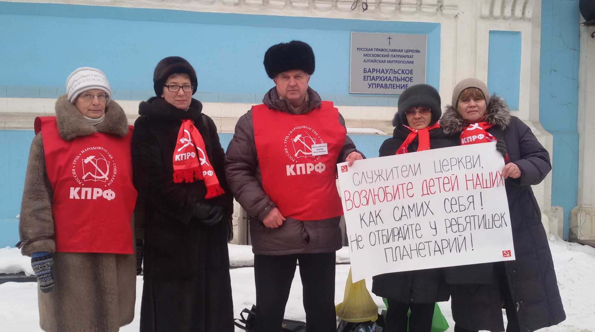 В Барнауле гражданские активисты и сторонники коммунистической партии провели пикет в центре города с требованием не допустить передачу здания местного планетария в собственность православной епархии. Как сообщил корреспонденту "Сибирь.Реалий" один из участников акции протеста Юрий Красильников, они не только требуют от властей отказать РПЦ в этом, но и хотят защитить парк "Изумрудный", на территории которого находится научное учреждение.