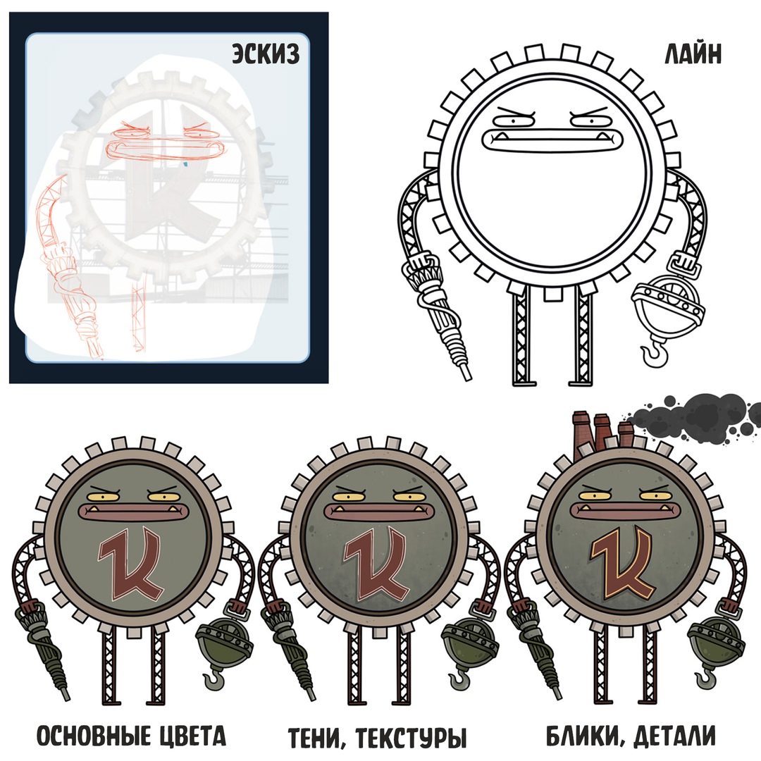 Живую шестеренку со злым лицом Лопатин нарисовал для игры «Большая Настолка». В руках персонаж держит оружие, а из труб на его голове идет дым.