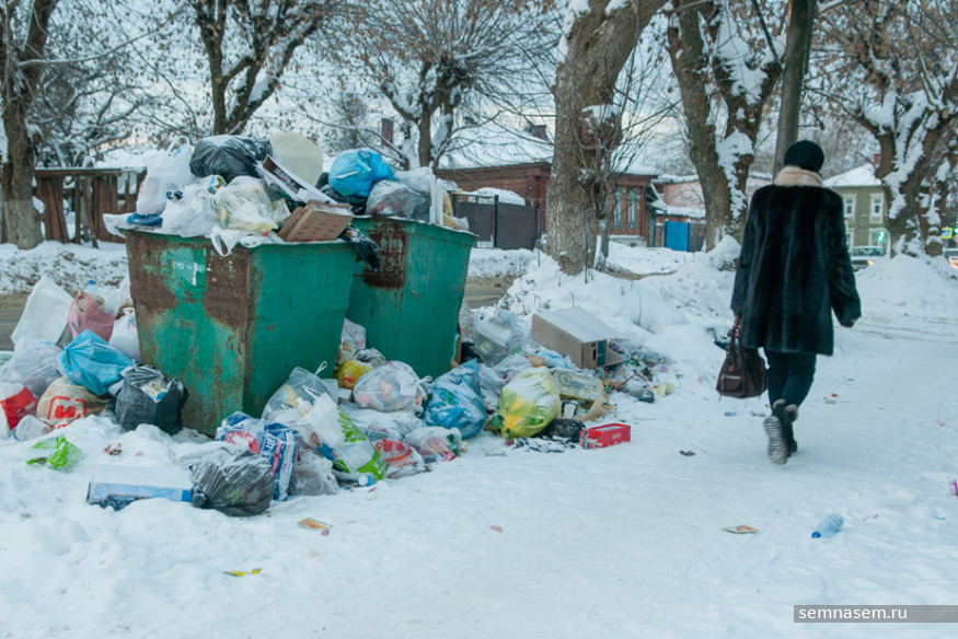 Фотокорреспондент «7x7» Алексей Молоторенко побывал на мусорных площадках на улицах Энгельса, Мясницкой, Шагова и у площади Мира 10 января:
