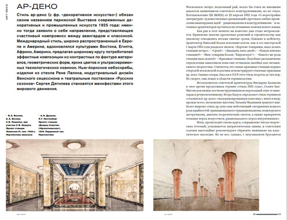 Пропустив рационализм, Евгения Гершкович начинает описывать стили московского метро с предвоенного ар-деко В гиде сохранена стандартная структура. За кратким введением следуют 23 страницы с небольшими главками о стилях оформления метро — от ар-деко до неомодернизма. Отчасти сведения в них дублируют основной блок о станциях, причем без каких-либо внутренних отсылок. Какая из них принадлежит к какому стилю, где соцреализм, а где сталинский ампир, читателю предстоит догадываться самому.