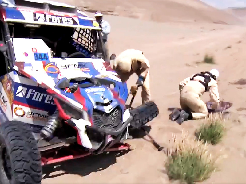 Российский гонщик Сергей Карякин из команды Snag Racing повредил свой багги в аварии в ходе седьмого этапа ралли-марафона "Дакар-2019". Экипажу удалось починить мотовездеход, однако потери на этапе вышли фатальными.