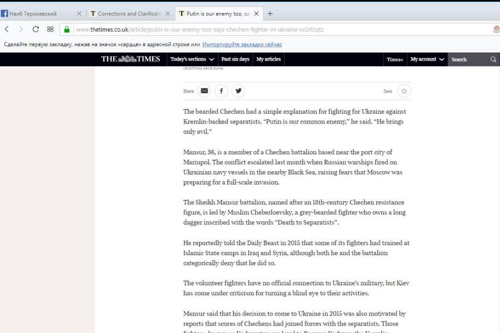 В публикации The Times за 26 декабря с комментарием Муслима Чеберлоевского (лидера батальона имени Шейха Мансура) сказано, что некоторые чеченцы, которые сегодня воюют в Украине, ранее сражались в рядах экстремистских группировок на Ближнем Востоке. Журналист делает такой вывод, опираясь на рассказы Чеберлоевского и его бойцов.