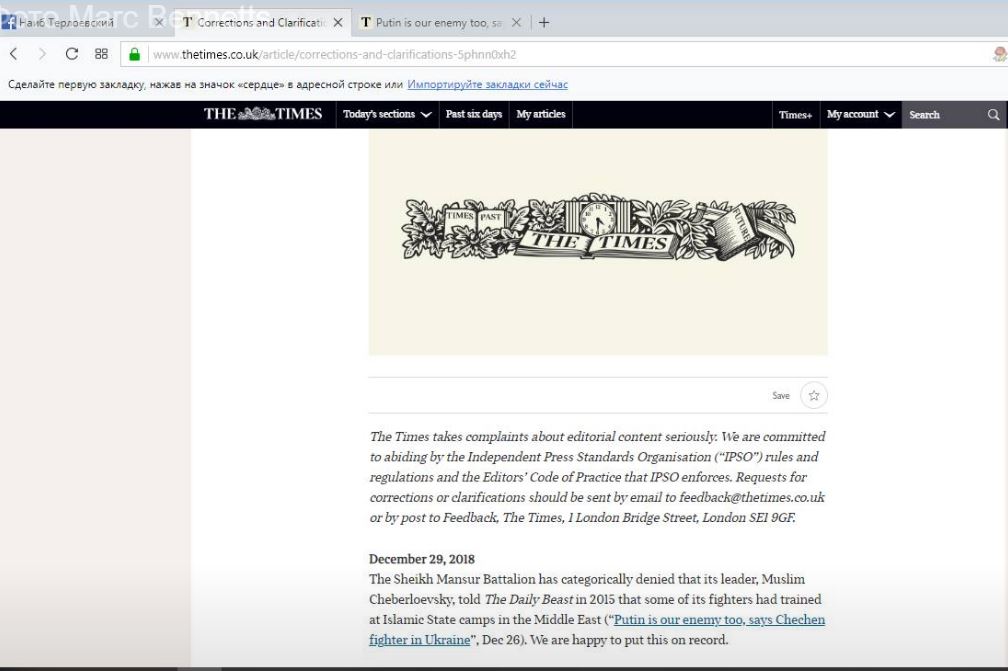 "Батальон Шейха Мансура категорически отрицает, что его командир Муслим Чеберлоевский заявлял Daily Beast в 2015 году, что некоторые из его бойцов ранее проходили подготовку в лагерях 'Исламского государства' на Ближнем Востоке", - говорится в публикации The Times за 29 декабря.