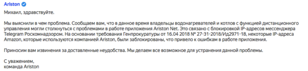 Согласно ответу с официального аккаунта Ariston, проблема с подключением водонагревателя к WiFi связана с блокировкой Telegram Роскомнадзором. В компании отметили, что с такой проблемой могли столкнуться все владельцы устройств.
