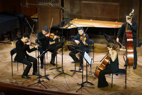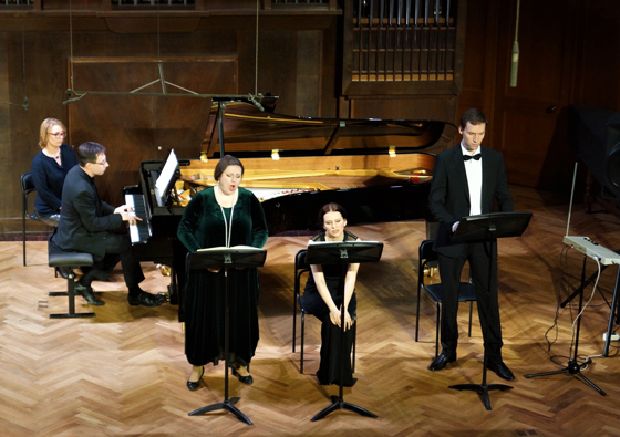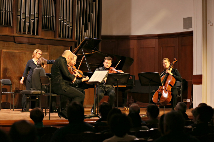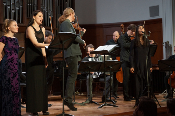 © Ирина Шымчак Фестиваль начался с триады средневековых сочинений, создатели которых — два короля и один папа римский — частично состоят друг с другом в родстве (раз начав плести узор смыслов, остановиться уже сложно). Две песни на старофранцузском и григорианский респонсорий вряд ли бы в другом случае прозвучали в стенах Малого зала; исполненные как сюита, они (правда, не впервые) открыли Романа Минца как яркого исполнителя на колесной лире. Далее расположились сочинения, созданные русским драматургом, американским страховым агентом, выпускником физмата, химиком, юристом, актером-комиком и т.д.; украшениями концерта стали прелестный неоконченный секстет А.П. Бородина и месмерическое «Прощание» Джачинто Шельси в исполнении Вадима Холоденко — к сожалению, отчасти испорченное зазвонившим у кого-то телефоном. Квинтет Георгия Катуара, занявший большую часть первого отделения, напоминал одновременно Танеева и Франка и изобиловал длиннотами; впрочем, прелесть программ фестиваля именно в том, что музыка освобождается от обязательств «быть гениальной» перед слушателем: она должна лишь подходить под тему концерта, и порой именно несуразные и странные опусы оказываются особенно любопытны и хороши. В «Ремейках», открывшихся хонтологическими «Песнями советских композиторов» Леонида Десятникова, сверхъестественно прозвучали «Голоса под стеклом» Сальваторе Шаррино: жуткие, с развращенно-изысканной темброписью обработки мадригалов Джезуальдо — одиозного ренессансного аристократа, композитора и душегубца. «Нео», программа — игра в стили, сопоставила краудплизер «Le Grand Tango» Пьяццоллы, с шиком сыгранный Борисом Андриановым и Андреем Гугниным, c головоломным Брайаном Фернихоу в исполнении флейтистки Марии Алихановой или с пьесой «На горизонте» Вольфганга Рима, в центре которой — эффект зияния, пустота в звуке и пространстве сцены. Программа четвертого концерта, традиционно построенная без всяких концепций, из «заказов» участников фестиваля, — это «Возвращение» в чистом виде: ретрофутуристическая Фантазия Богуслава Мартину для терменвокса, гобоя и фортепианного квинтета могла бы звучать как аттракцион, но оказалась чудесной пьесой, похожей на встречу музыки Равеля с темой из «Доктора Кто». Тут же звучали мегалиты классического репертуара — фортепианный квинтет Дворжака и цикл Шостаковича «Из еврейской народной поэзии», сыгранный Александром Кобриным и спетый Яной Иваниловой, Светланой Злобиной и Александром Нестеренко с такой силой, что по залу, казалось, гулял кладбищенский сквозняк.