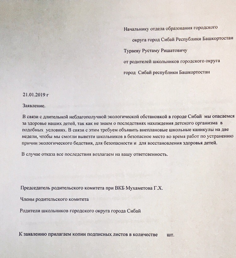 "В связи с длительной неблагополучной экологической обстановкой в городе Сибай мы опасаемся за здоровье наших детей, так как не знаем о последствиях нахождения детского организма в подобных условиях. В связи с этим требуем объявить внеплановые школьные каникулы на две недели, чтобы мы смогли вывезти школьников в безопасное место во время работ по устранению причин экологического бедствия. В случае отказа все последствия возлагаем на вашу ответственность", — говорится в обращении, которое сибайцы намерены направить на имя начальника городского отдела образования Рустама Тураева.