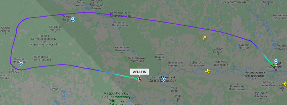 Согласно данным авиационного сервиса Flight Radar, на одном из самолетов, которые следовали в районе Сургута, произошла нештатная ситуация. По данным сервиса, речь идет о рейсе SU1515 /AFL1515, который выполнял «Аэрофлот».