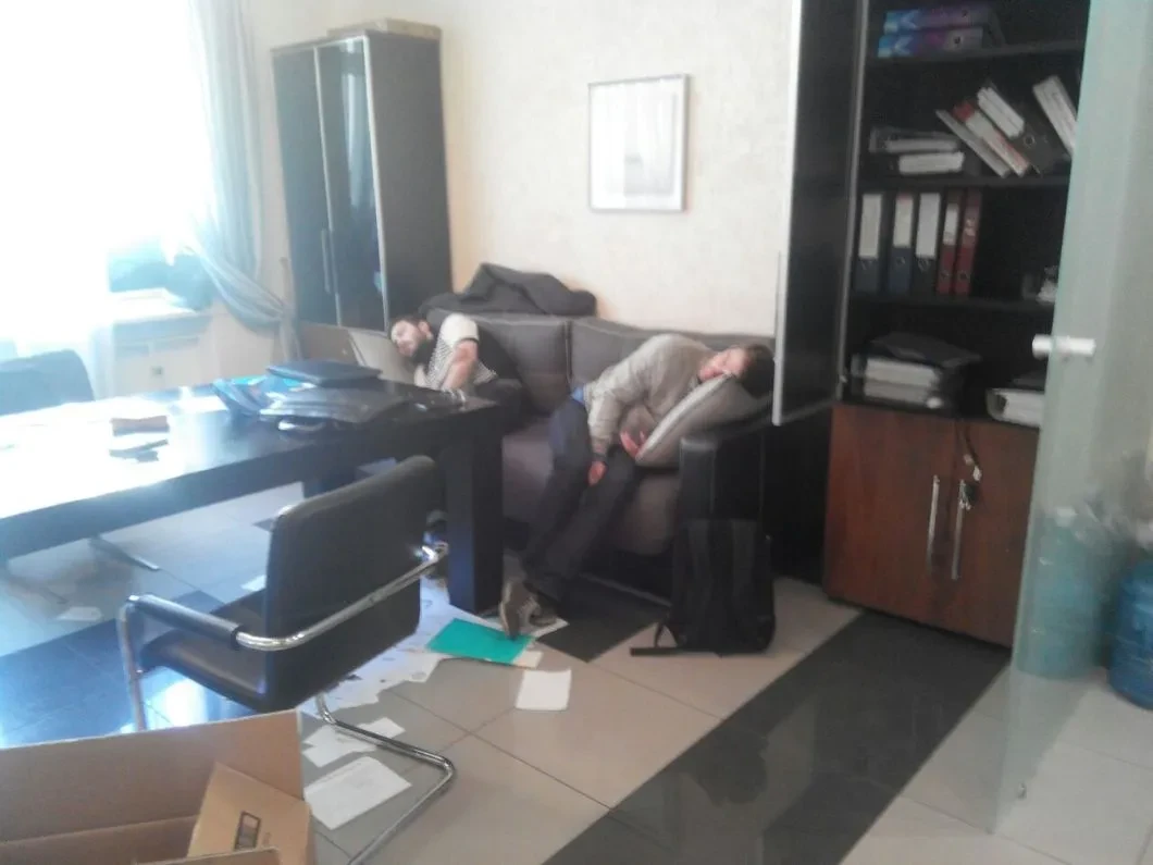 Обыск проходил нестандартно: следователь сидел за столом и записывал что-то в протокол, понятые спали рядом на кушетке, а граждане в балаклавах доставали из всех ящиков и шкафов адвокатские документы, часть сваливали на пол, часть передавали следователю.