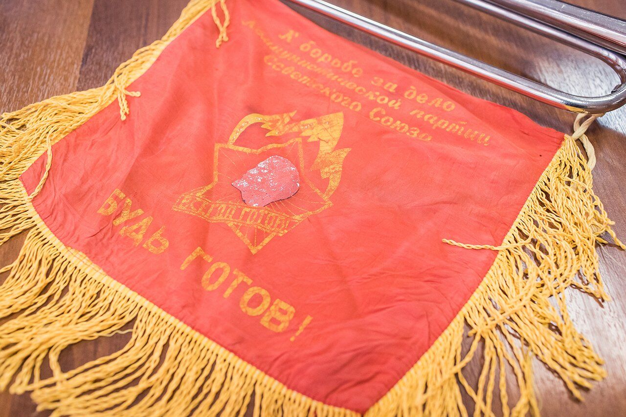 Shibaev said every Pioneer at the school receives a real Pioneer kerchief made in the late 1980s. “We got lucky,” he recalled, “in the early 1990s, a textile factory in St. Petersburg reached out to us to say they had a store of kerchiefs they had sewn that weren’t needed anymore because of the [Soviet] Union’s collapse. They gave them to us, we gladly took them, and now every year we hold a ceremony for the kids to receive them.” According to the principal, the school now owns only about 300 more Soviet kerchiefs, and when those run out, he will have to place an order to get more.