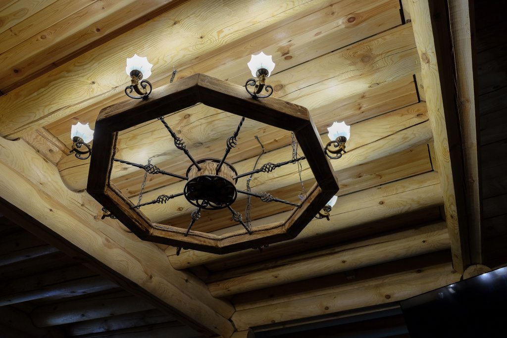Негоже в деревянном доме вешать вульгарную люстру из магазина — только ручная работа, только хардкор. Весит такая конструкция около 30 кг. и специально подвешена на цепях. Мало ли...