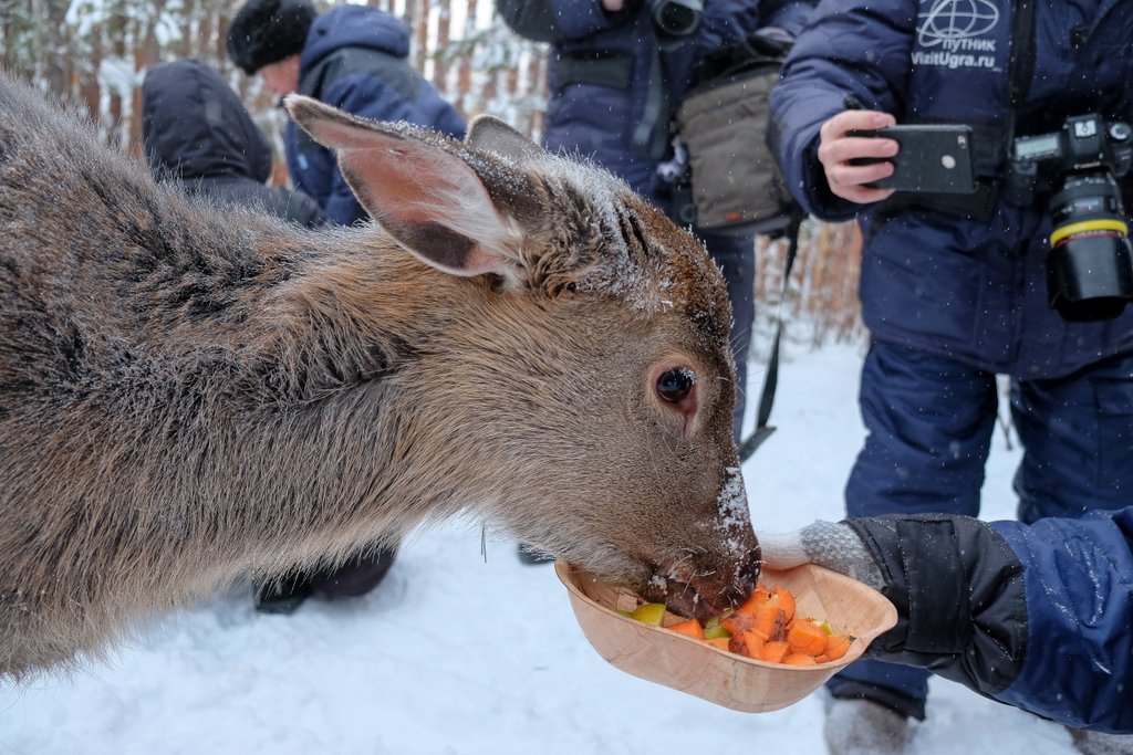 Ни грохот затворов больших камер, ни писк электроники от угощения животную отвлечь не смог. Нос потрогал — мягкий, не лошадиный, но тоже приятный. Шкурка, кстати, мягше, чем у привычных нам северных рогачей...