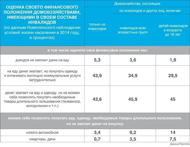 В глубинах статистики найдем таблицу «Оценка своего финансового положения домохозяйствами, имеющими в своем составе инвалидов». Информация в таблице, размещенной на сайте Росстата, есть только за 2014 год, но с тех пор в стране стало только хуже. Итак, у 5,3% не хватает денег на еду. Это 686 138 инвалидов (В России в 2014 году было 12 миллионов 946 тысяч инвалидов). Почти семьсот тысяч инвалидов не знают, где взять деньги на еду, но это не было и не является темой для огромного, разбухшего, самоводрузившегося над Россией, пронизанного тайными ходами, как крысиный дом, государства.