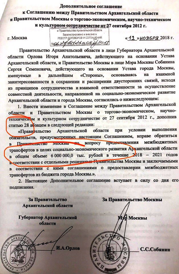 В отправке мусора на Север, естественно, заинтересованы и архангельские власти. Телеграм-канал «АрхСвобода» 24 января опубликовал соглашение о торгово-экономическом, научно-техническом и культурном сотрудничестве. Подписанное губернатором Архангельской области Игорем Орловым и мэром Москвы Сергеем Собяниным. В документе от 12 ноября 2018 года говорится о траснсфертах из московского бюджета в архангельский «в целях социально-экономического развития области». За три года область получит от столицы 6 млрд. руб. Как будут потрачены эти деньги, неизвестно: до сих пор архангельские власти отрицают даже сам факт соглашения с Москвой.