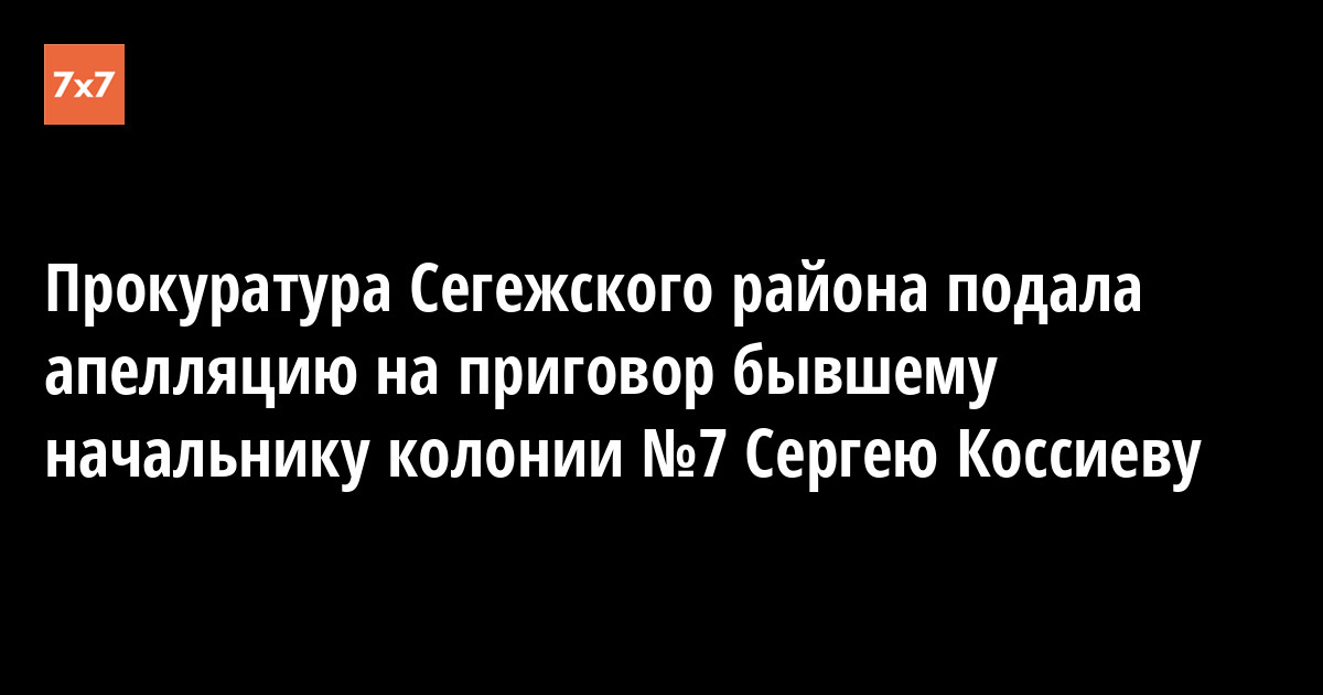 В коллегию по уголовным делам Верховного суда Карелии 22 января поступила апелляция от помощника прокурора Сегежского района Ю. Дудлиной, в котором районная прокуратура попросила отменить приговор бывшему начальнику колонии №7 Сергею Коссиеву и его заместителю Анатолию Луисту. Об этом «7x7» 29 января сообщил адвокат потерпевшей стороны Павел Котов.