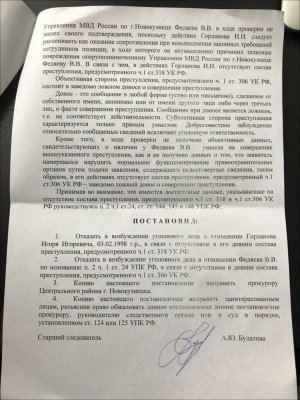 «Я никакого заявления еще не писал, но считаю неправильным отказ по 306-й статье, это, как минимум, необъективно, — заключает Горланов. — В отделе они мне угрожали всячески, их действия были намеренными и целенаправленными, судя по их разговорам, они уже собирались меня закрыть».