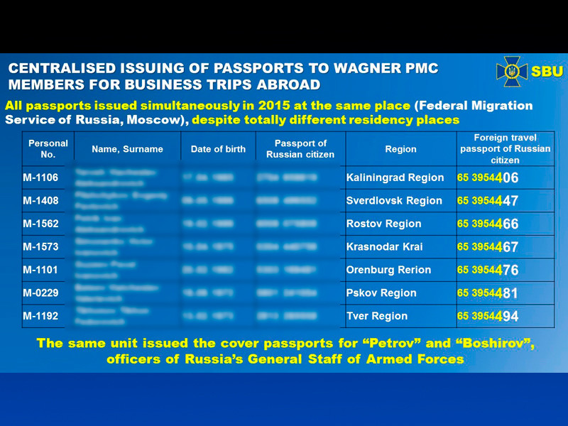 По итогам пресс-конференции СБУ были опубликованы списки предполагаемых наемников ЧВК Вагнера. Первые два списка включали имена, даты и места рождения, а также номера внутренних и загранпаспортов одной серии, выданных в 2015 году, и еще девяти, выданных в 2017 году. Примечательно, что у людей в списке указаны места рождения со всей России, но орган выдачи паспортов во всех случаях - московское отделение 770-001.