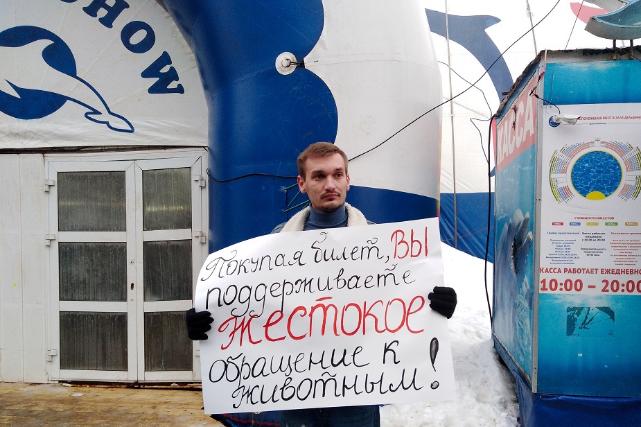 Андросов и другие активисты «Скорой молодежной помощи» в конце декабря провели четыре акции, чтобы привлечь внимание властей к проблеме содержания животных в передвижных дельфинариях и убедить белгородцев не покупать билеты на шоу. Активисты требуют запретить деятельность передвижных дельфинариев в России. Они считают, что животных перевозят в тесных контейнерах, а в бассейнах, где они выступают, — хлорированная вода, что негативно сказывается на их здоровье.
