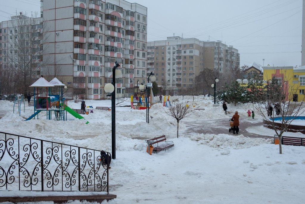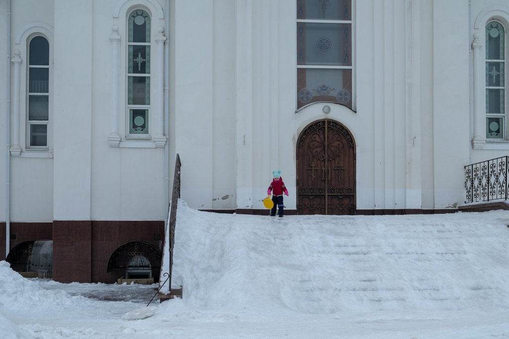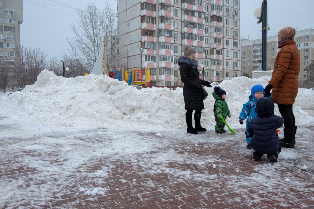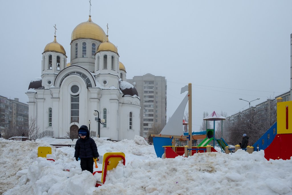 Если влезть на крылечко храма, то картинка представляется более полно. Ребятня и родители тусят на обледеневшей плитке, а на детских комплексах никого нету... Кто нашел Пирожка на карточке, тот большой молодец!