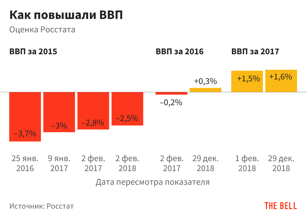 - По предыдущему опыту можно предполагать, что и без того высокая цифра 2,3% в будущем вырастет еще. Сегодняшняя оценка — только первая, а по правилам Росстат оценивает ВВП пять раз, и цифра часто меняется. Показатели за 2015–2017 годы ведомство пересматривало шесть раз, и каждый раз — в сторону повышения. Так, падение за 2015 год к пятой оценке сократилось на треть (2,5% против 3,7%), а рецессия 2016 года (-0,3%) превратилась в небольшой, но рост (0,2%). К ВВП за 2017 год пересмотр пока добавил только 0,1 п.п. (но по тому году пока опубликовано только три оценки).