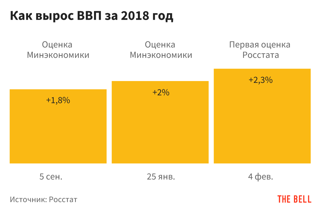 Росстат объявил о росте российского ВВП в 2018 году на 2,3%, в очередной раз превзойдя ожидания экономистов. Это на 0,3 п.п. больше, чем объявлял министр экономики Максим Орешкин 10 дней назад в Давосе, и на 0,5 п.п. больше, чем прогнозировало до этого Минэкономики.