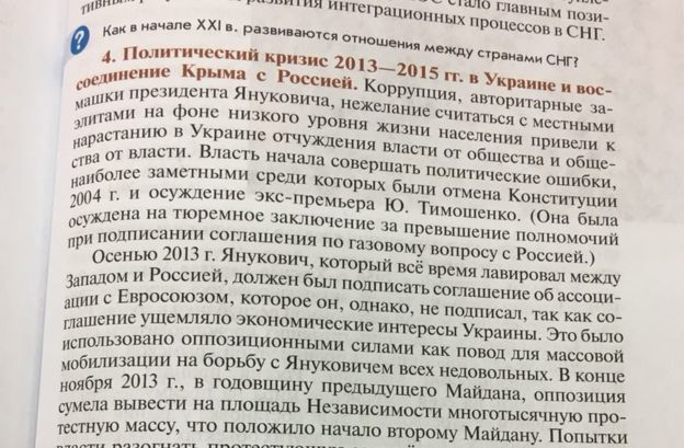 При этом весь остальной текст параграфа выдержан в абсолютно поддерживаемой государством риторике. Например, есть такие описательные фрагменты: «Когда возникла опасность грозящих кровопролитием столкновений между полноценной крымской автономией и сторонниками Майдана, Россия приняла решение временно взять на себя сохранение мира на преимущественно русскоязычном полуострове». Особенно интересны задания к этой главе учебника, например, предлагается ответить на вопрос «Почему население Крыма и Севастополя в своем большинстве приветствовало присоединение к России и активно участвовало в этом процессе?»