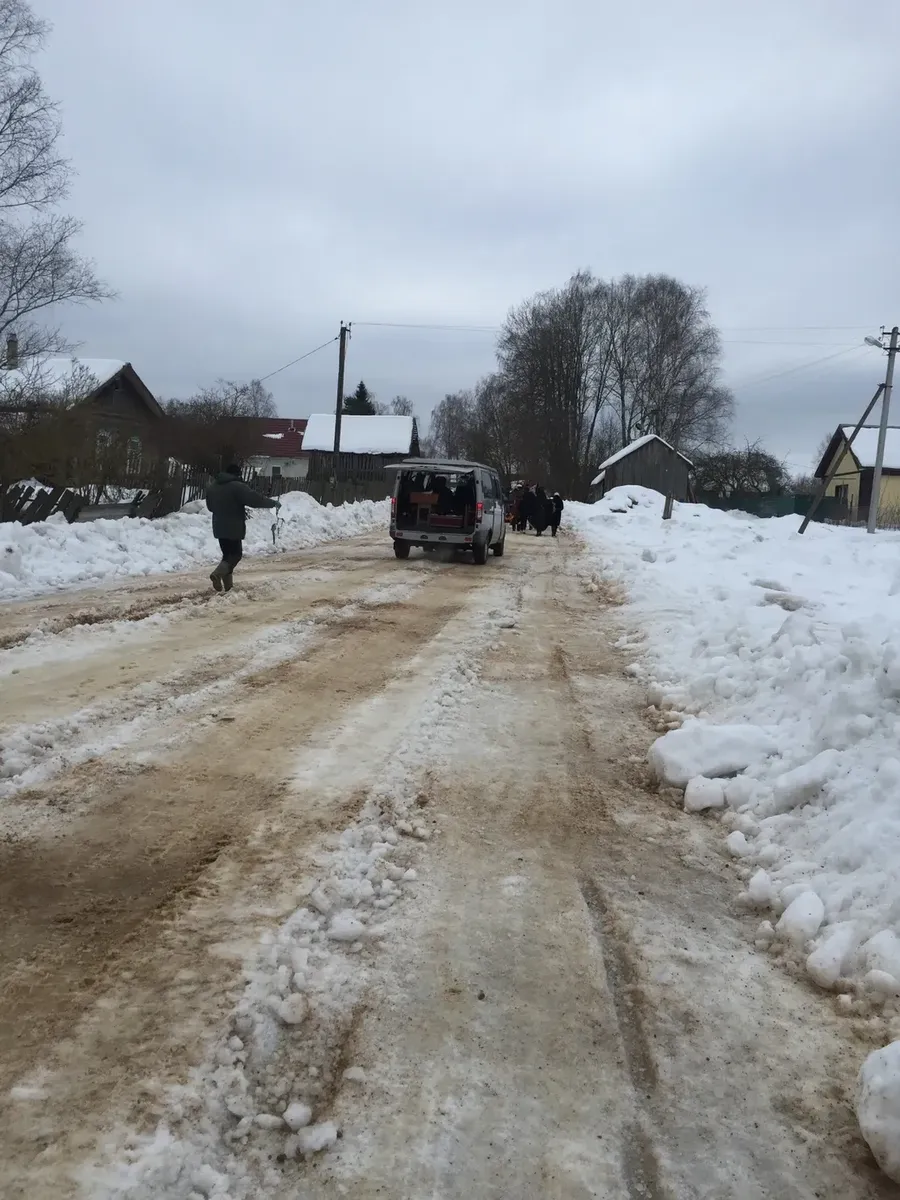 Маленький гроб ставят на скамейку в кузове, большой — рядом. Задние дверь фургона не закрываются. Машина готова была тронуться, но провожающие замешкались, вспоминая кто должен идти впереди фургона. В итоге все выстраиваются «по правилам»: крест и венки идут первые, потом фургон, а за ним тянутся остальные люди, бросая на песок со льдом цветы и еловые ветки. Машина двигается медленно, слегка буксует, когда колеса попадают в снежную кашу. Все они идут вверх по дороге, которая заканчивается сельским кладбищем.