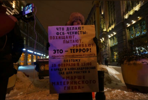 Как рассказал ОВД-Инфо волонтер ГПЗ Александр Миронов, активистка стояла с плакатом о ФСБ, трех уголовных делах «Сети», «Нового Величия» и участницы «Открытой России» Анастасии Шевченко и о «Марше материнского гнева».