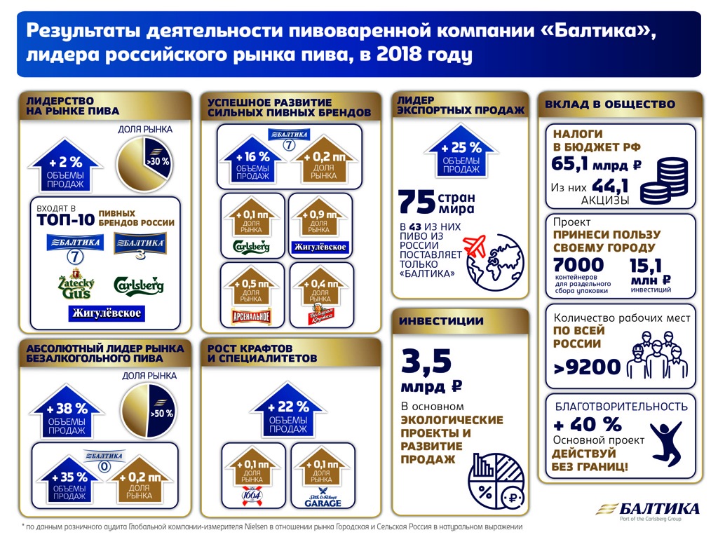 Итоги социально-экономической деятельности компании за 2018 год показывают, что пивоваренная компания «Балтика» является бесспорным лидером российского рынка и флагманом отраслевой бизнес-среды. Философия компании, оптимальное управление бизнес-процессами, реализуемый комплекс экономических и социальных проектов, внедрение инноваций, инвестиции в развитие бизнеса, высокий уровень вовлеченности сотрудников в процесс — все это обеспечивает твердые лидирующие позиции и стабильное динамичное развитие ведущей пивоваренной компании России.