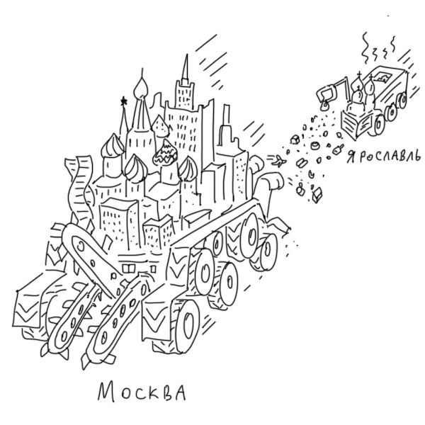 Анонимный российский художник Дюран нарисовал комикс по мотивам фильма «Хроники хищных городов», в котором города ездят на гигантских колесах и поглощают поселения поменьше (а еще там есть оружие под названием «Медуза»!). В версии Дюрана участвуют Иваново, Тула, Новосибирск, Омск и другие российские города. Обратите внимание на Москву (чей мусор развозят по регионам) и Санкт-Петербург (который занесло снегом). «Медуза» с разрешения автора публикует комикс целиком.